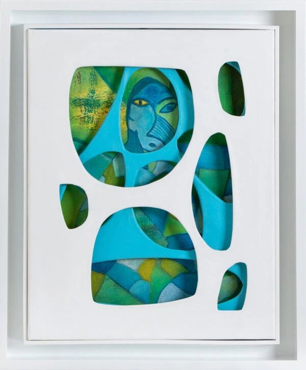 A vibrant 3D acrylic artwork featuring bold geometric shapes and expressive forms revealed through sculptural cut-outs. Layers of color and pattern create depth and intrigue, drawing the viewer’s gaze into the playful, watchful composition.