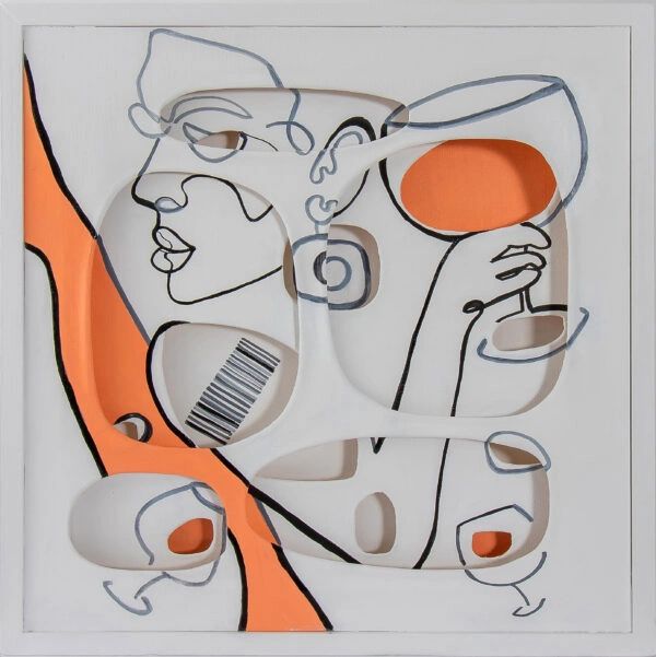 A striking 3D acrylic artwork combining expressive line art with sculptural cut-outs. Bold black lines and vibrant orange accents create depth and movement, capturing a contemporary portrait inspired by human expression and creativity.