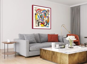 The artwork is composed of four interconnected panels, each revealing fragments of expressive faces and gestures. When viewed together, the panels form a lively dialogue between personalities — curious, bold, mysterious, and joyful.