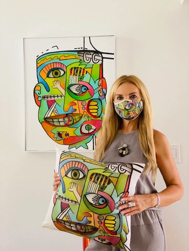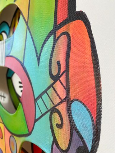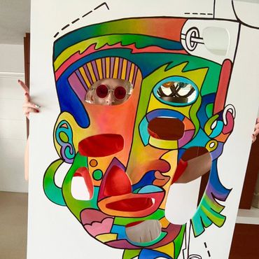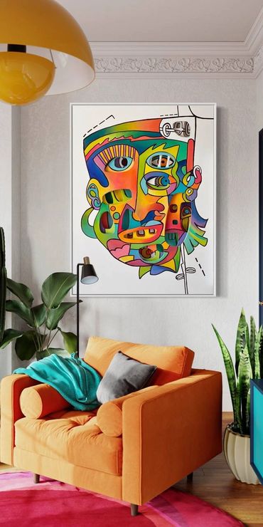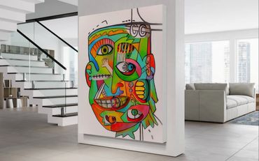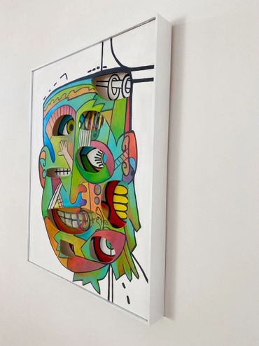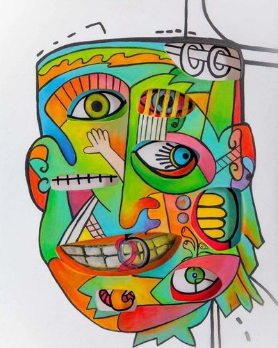 Bright greens, oranges, blues, and pinks collide in a playful rhythm, creating a dynamic composition that feels alive. The fragmented face suggests different thoughts, emotions, and perspectives existing at the same time—just like in real life. Every section of the face feels like its own character, yet together they form a powerful whole.