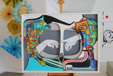 Using her signature 3D Cut Canvas technique, Zhanna Thomas literally opens the canvas, creating physical depth within the painting. The central opening reveals a quiet grey space between the figures, emphasizing the mysterious distance that always exists between two individuals.