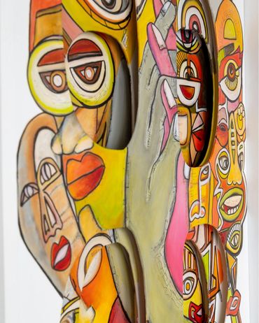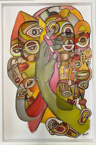 This work explores the complexity of human identity. The composition reveals a multitude of faces, symbols, and eyes layered within a single form, suggesting that the self is never singular but made of many voices, memories, and perceptions.
