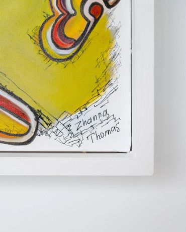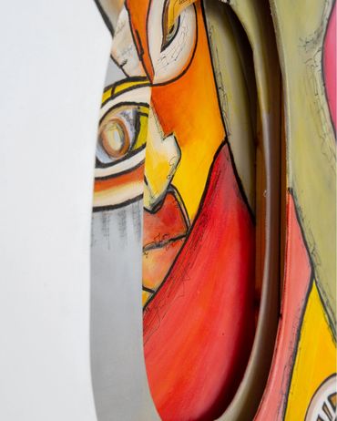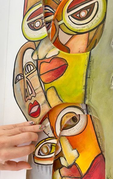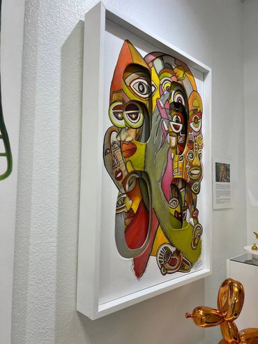 Created using the Cut Canvas Technique, the carved openings introduce depth and movement, allowing fragments of imagery to emerge from within the surface. These layers transform the canvas into a dynamic psychological landscape.
